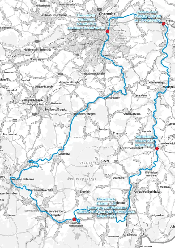 Start und Ziel: Chemnitz Hauptbahnhof (9.10 Uhr Abfahrt, 17.10 Uhr Ankunft)